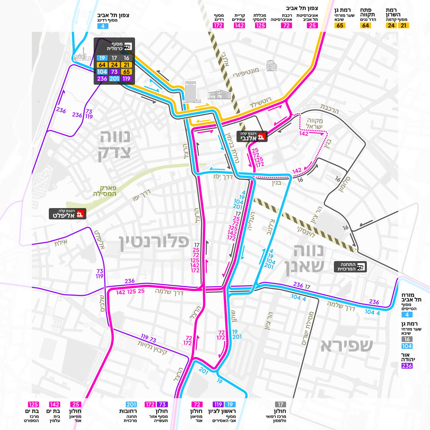 ב-3 במאי נסגרו רחובות אלנבי והעלייה בתל אביב לצורך העבודות על הקו הסגול. עשיתי מפת שינויים לא רשמית של קווי האוטובוס בתחנת אוטובוס אחת כדי להדגים יכולות העיצוב שלי