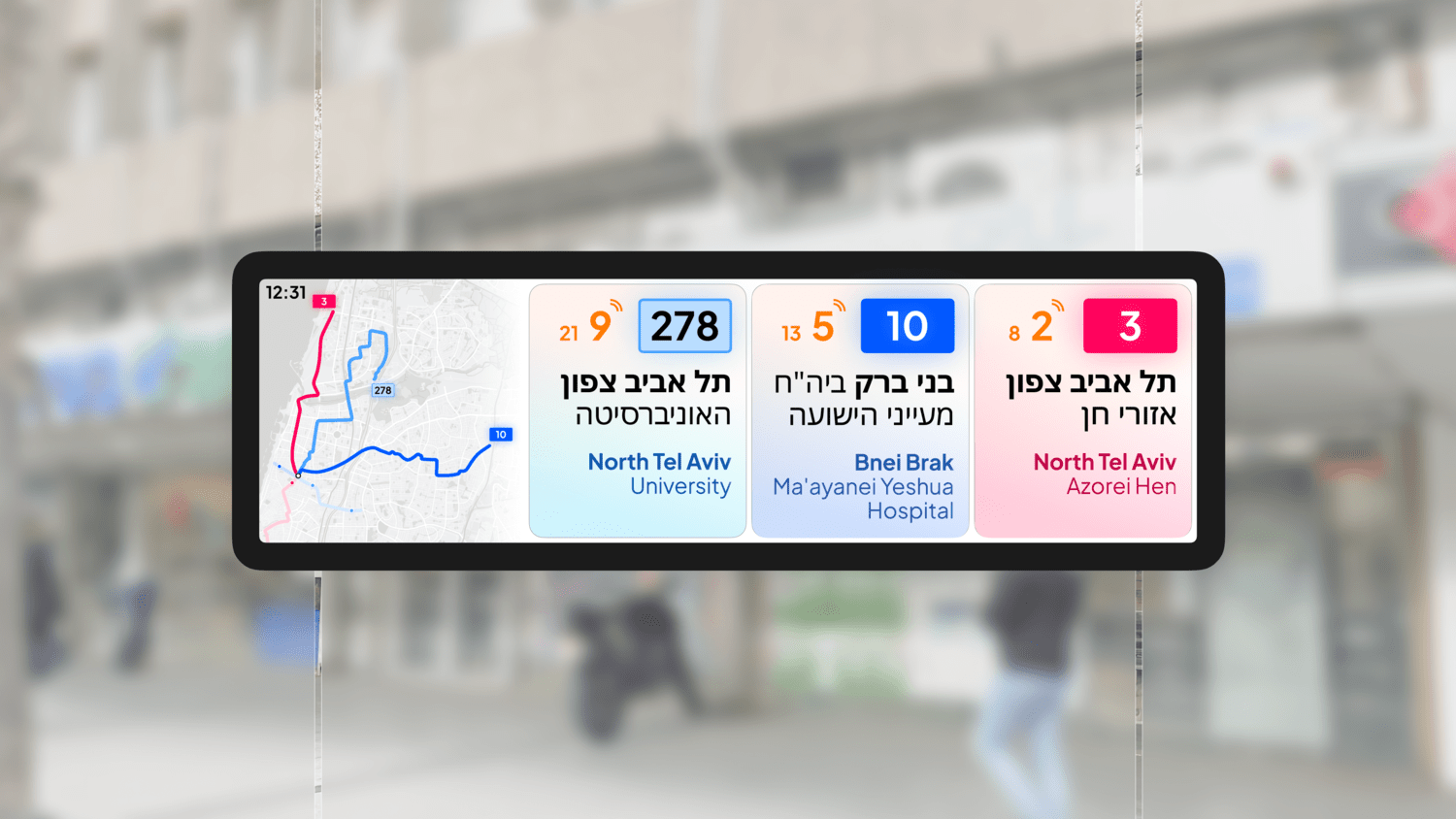 בנוסף למפת האוטובוסים, פיתחנו גם עיצובים למסכים עבור הרשת האסטרטגית: מסך זמני הגעת אוטובוסים בתחנות, מסך חיצוני לאוטובוס שמציג את מספר הקו והיעד שלו, ומסך פנימי לאוטובוס שמציג את מסלול הקו. העיצוב שלנו ייחודי ומותאם במיוחד לשימוש בשלוש שפות, תוך כדי הפחתת זמן ההמתנה במעבר בין השפות